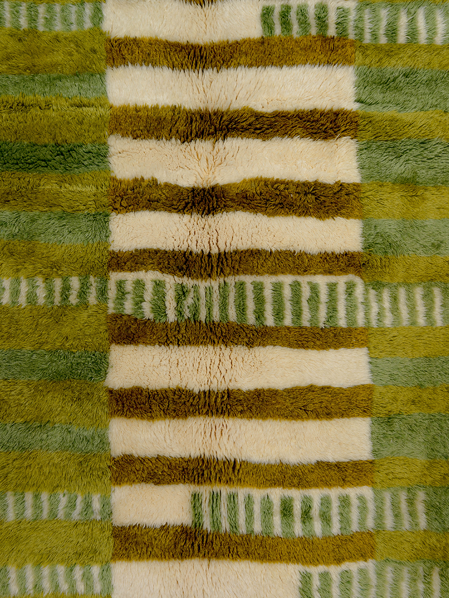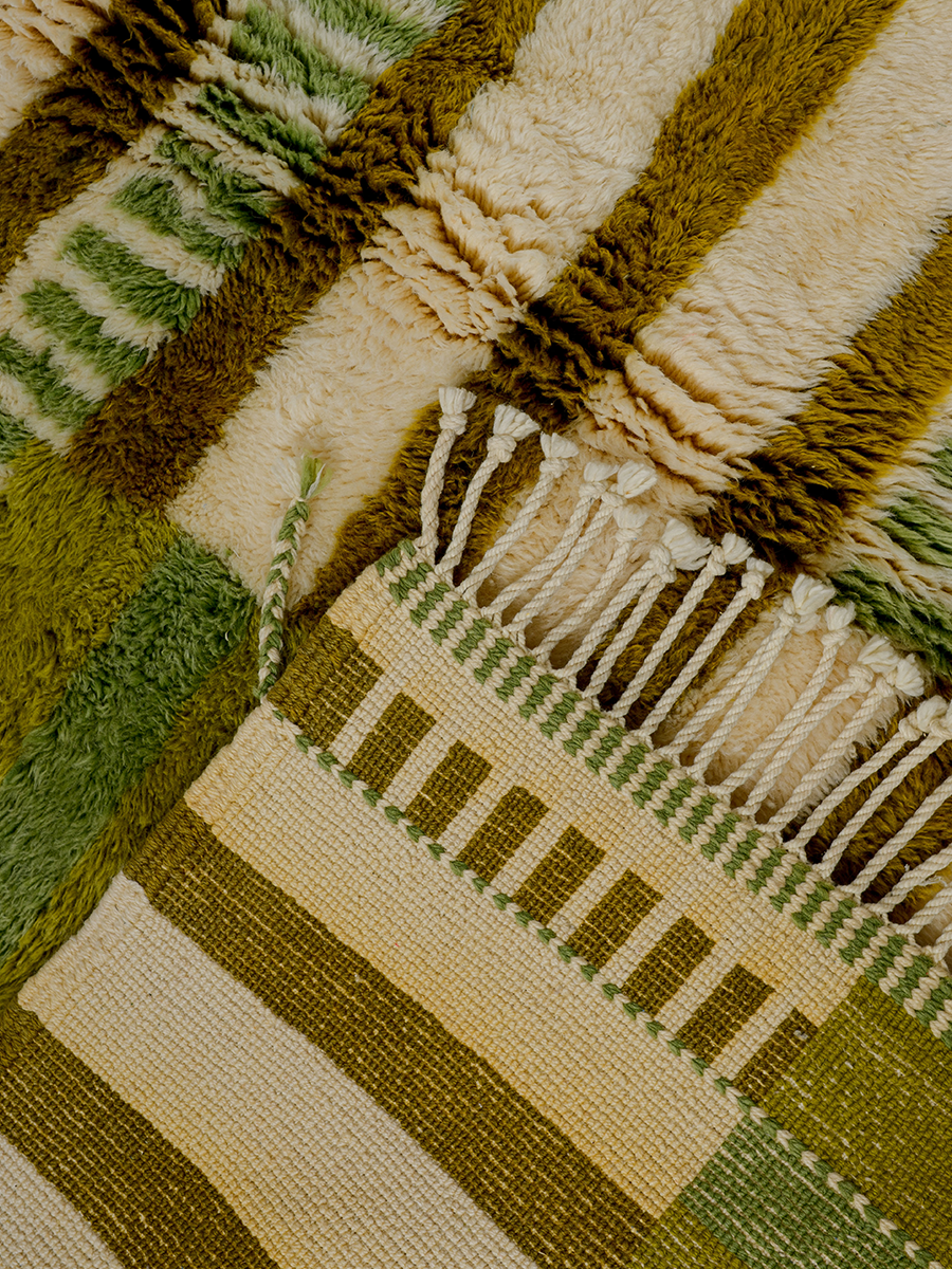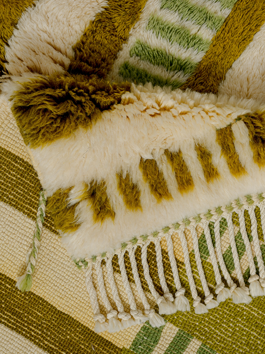 Soukina leads a group of 35 artisans from a village just outside Beni M’rirt in the Middle Atlas Mountains. Founded in the early 2000s by Soukina’s late mother, Ketlouma, the collective specializes in medium to high hand-knot rugs—a style named after the region—as well as M’rirt Zanafi rugs, their unique interpretation of the Zanafi style from the southeast. Traditional rugs from this area are crafted using a thick knotting technique, resulting in an extra-plush texture.